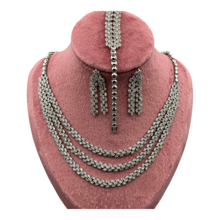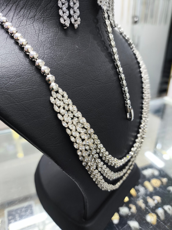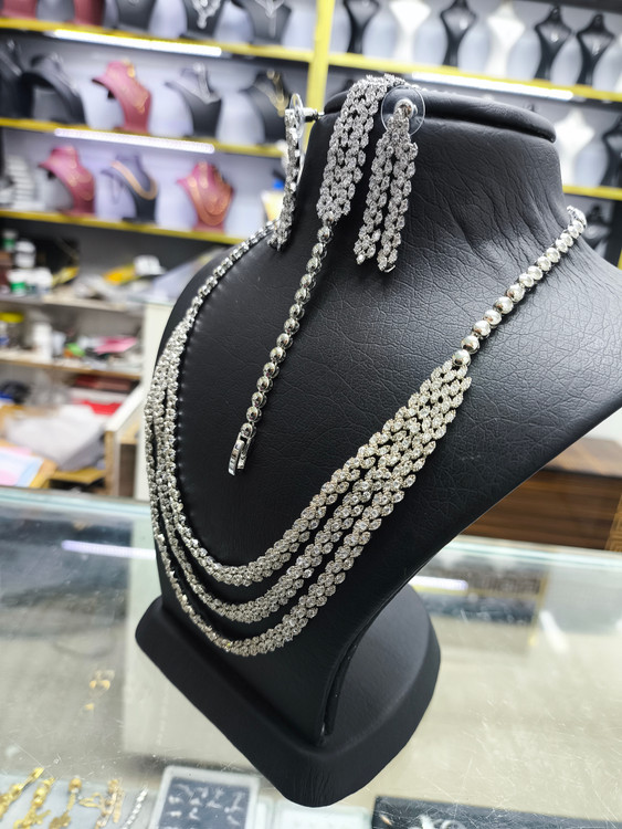 سرویس 3تیکه زنانه با آبکاری رادیوم، رنگ ثابت، مدل کپی شده از طلا، شامل گردنبند، دستبند و گوشواره ، مگینهای میکرو مخراج شده بدون ریزش